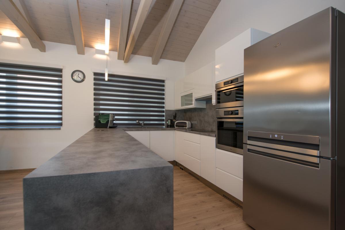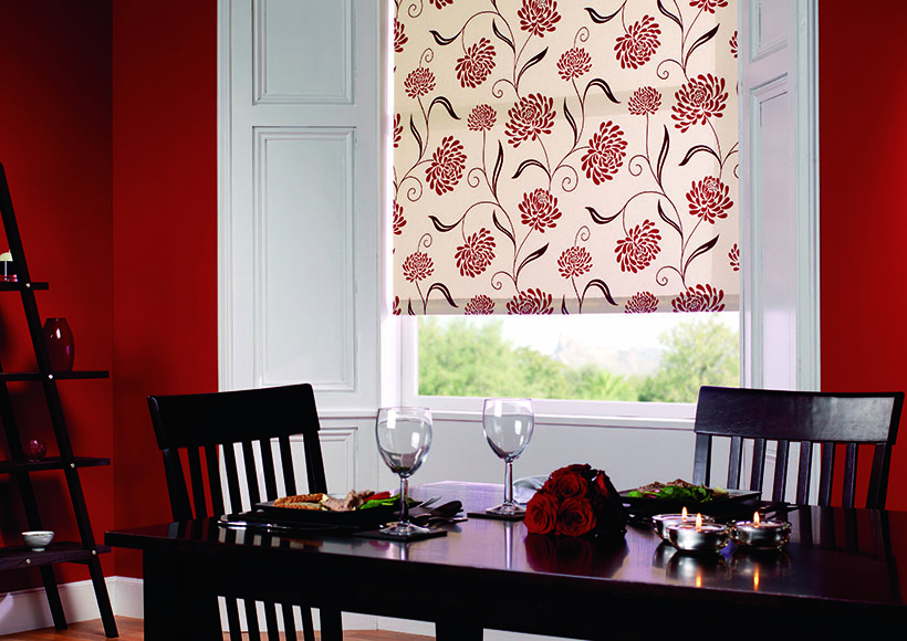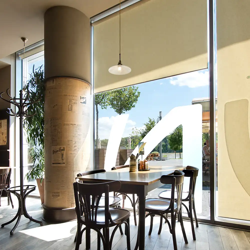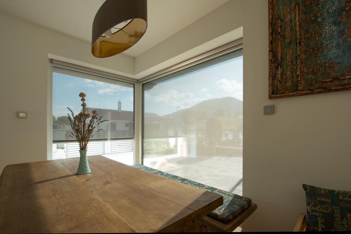 sezení v jídelně v pozadí poloprůsvitná látková roleta v bílé