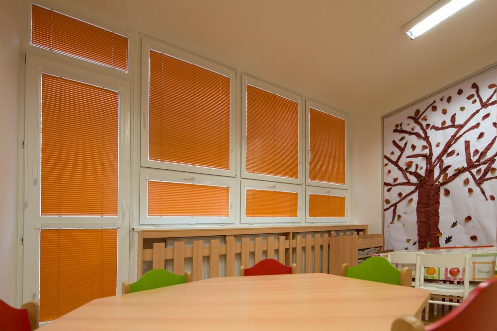 Vnitřní žaluzie na dvou oknech v kuchyni, před nimi stojí stůl
