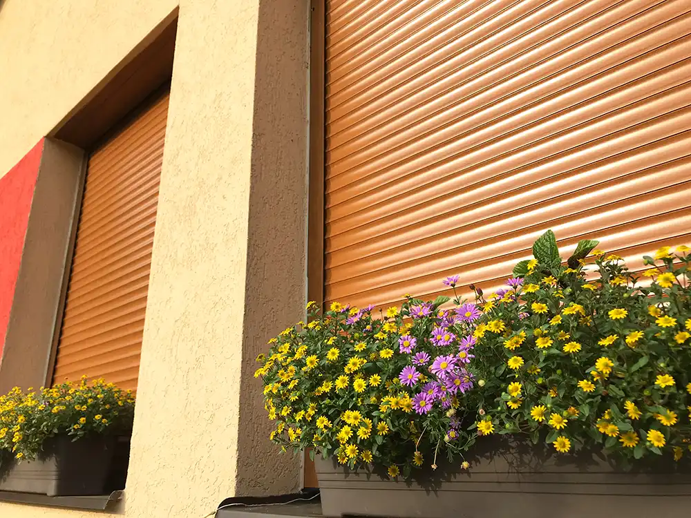 Venkovní rolety stažené s kytkami na parapetu
