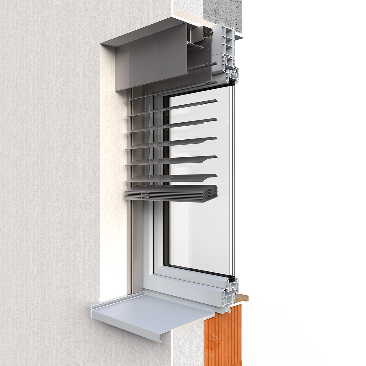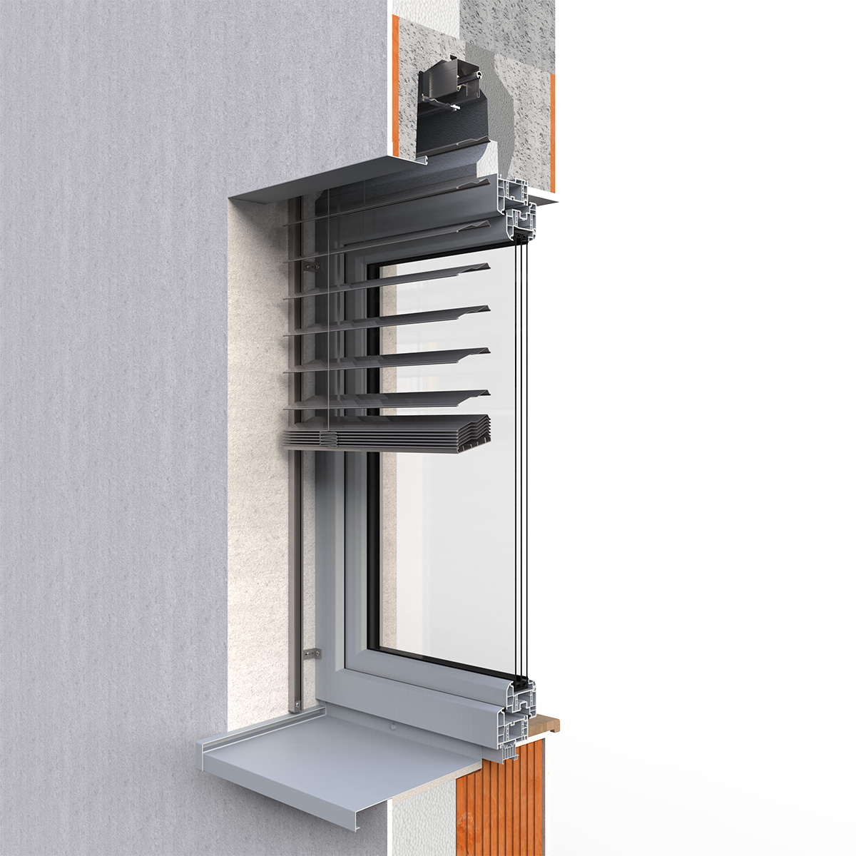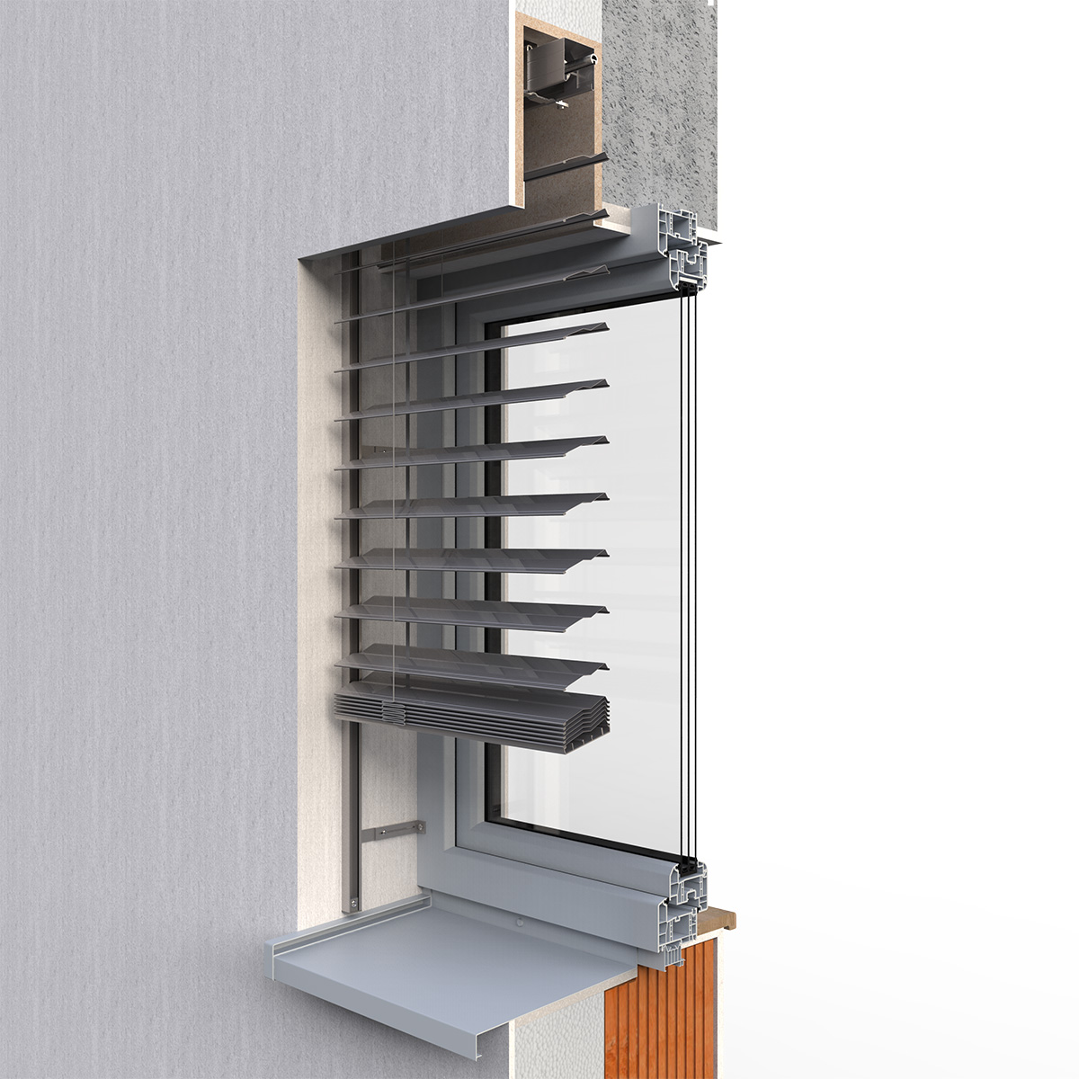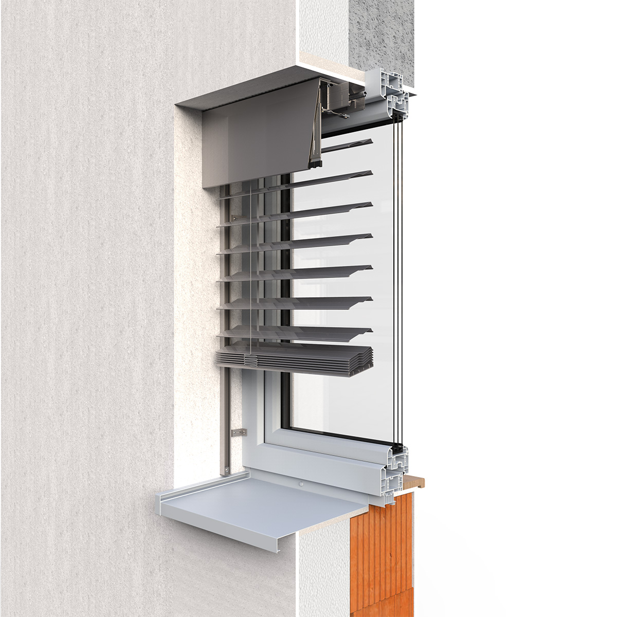 Hliníkový krycí plech zakrýva horný nosič aj zväzok lamiel a pri vytiahnutí vonkajšej žalúzie ich chráni pred poveternostnými vplyvmi. Farbu je možné zladiť s farbou žalúzií alebo fasády. Toto riešenie je perfektné pre dodatočnú montáž.